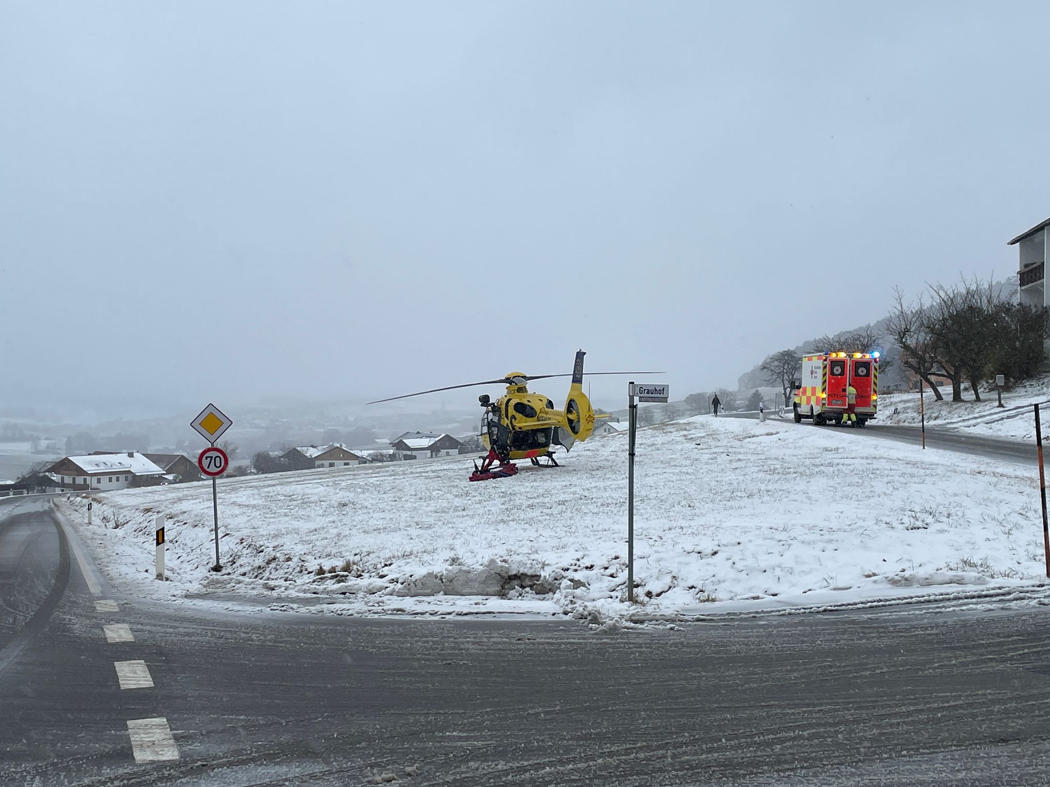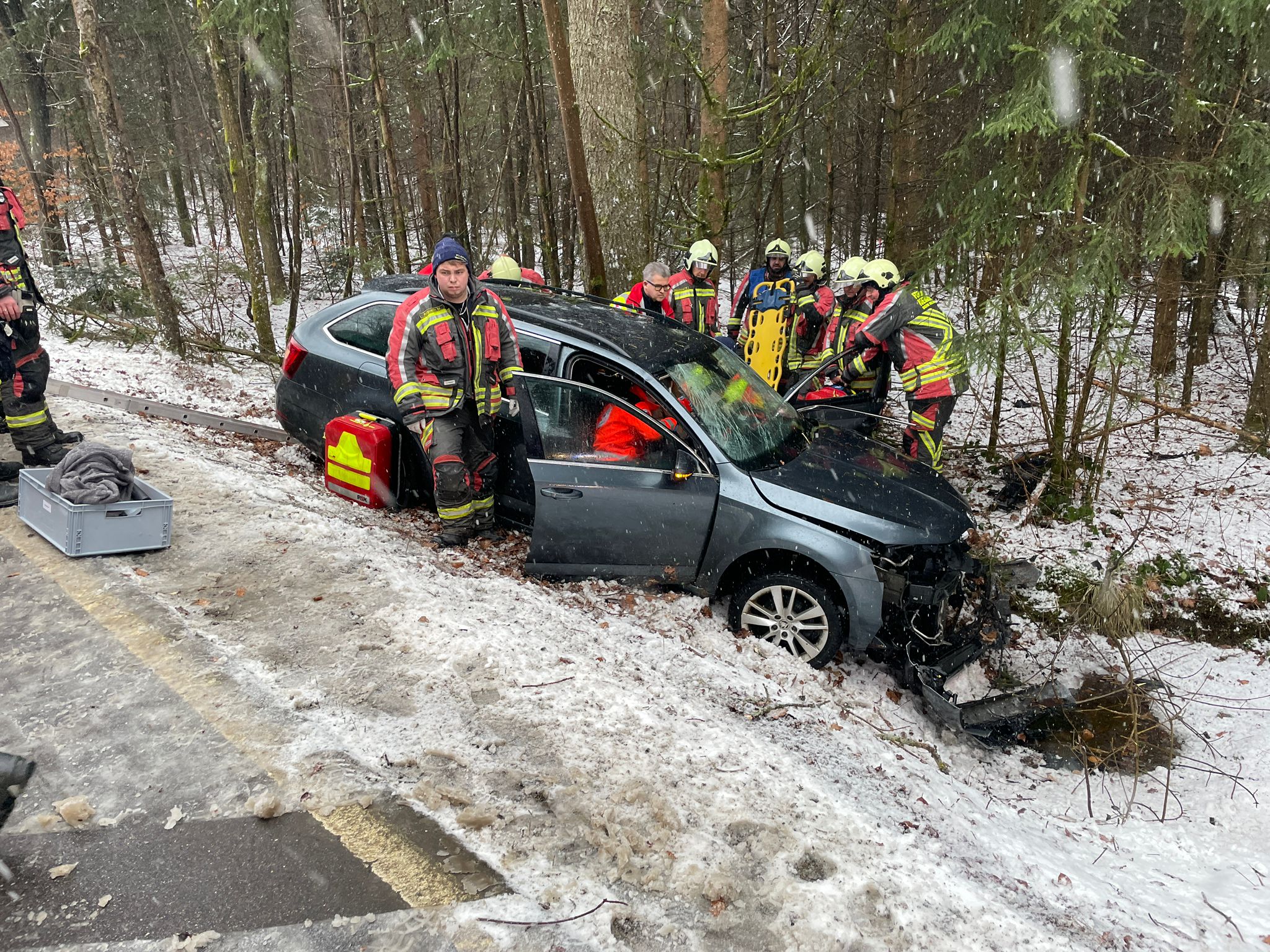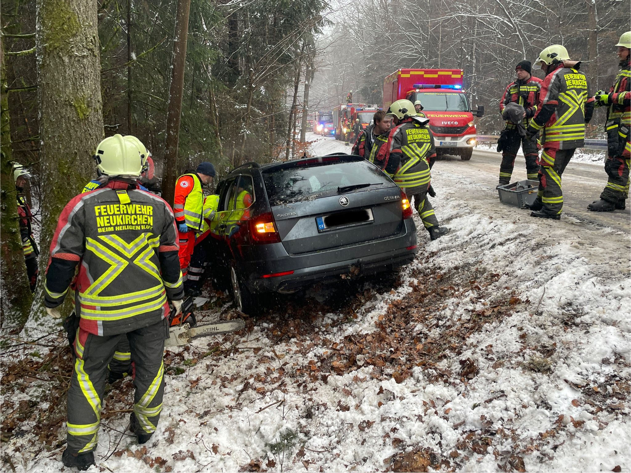 Am Nachmittag des 26.01.26 wurden die Feuerwehren aus Neukirchen b.Hl.Blut, Atzlern, Rittsteig und Eschlkam zusammen mit den Führungskräften des Landkreis Cham, dem Rettungsdienst und der Polizei zu einem schweren Verkehrsunfall auf der Kreisstraße CHA44 zwischen Grauhof und Hanger alarmiert. Hier war eine Frau aus Tschechien mit ihrem PKW von der schneebedeckten Fahrbahn abgekommen und gegen einen Baum geprallt. Die Fahrzeugfront wurde dabei massiv beschädigt und die Fahrertür verklemmt. Mit dem Rettungssatz der Feuerwehr Neukirchen b.Hl.Blut wurde ein Zugang zur verletzten Fahrerin geschaffen. Zudem wurde diese bis zum Eintreffen des Rettungsdienstes durch die Feuerwehr betreut. Parallel wurde mit der Kettensäge Gehölz beseitigt, damit die anschließende, schonende Rettung über das Spineboard erleichtert wurde. Dies geschah mit Abstimmung und in Zusammenarbeit mit dem Rettungsdienst. Die Vollsperre der Kreisstraße wurde durch die Wehren aus Atzlern und Rittsteig übernommen. Die Fahrzeuglenkerin wurde mit einem Rettungshubschrauber in eine Klinik transportiert. Nach der Unfallaufnahme durch die Polizei und die Bergung des Fahrzeugs durch ein Abschleppunternehmen konnte die Straße nach rund einer Stunde wieder freigegeben werden.