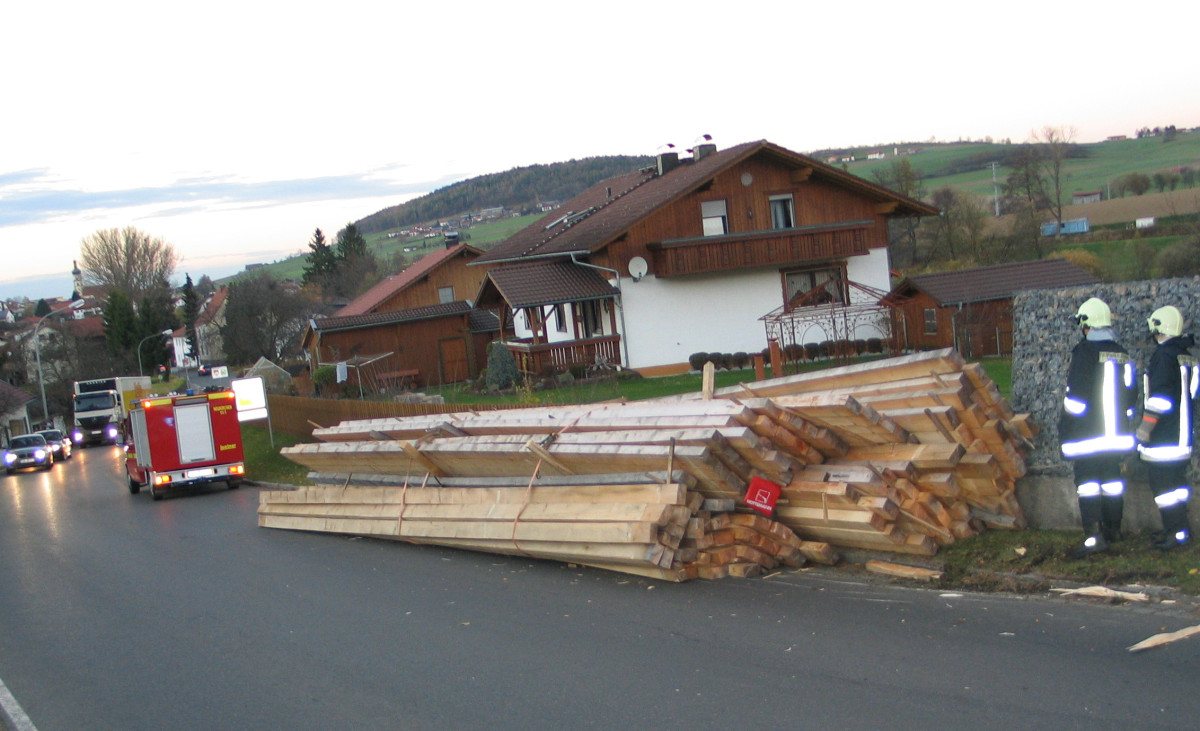 Unglaubliches Glück im Unglück hatte am späten Montagnachmittag ein Zimmerer. Gegen 16.30 Uhr wollte er vom Neukirchener Gewerbegebiet kommend nach links in die Staatsstraße einbiegen. Dabei kippte der Nachläufer seines 7,5-Tonners, auf dem Teile eines Dachstuhls geladen waren. Die Ladung prallte zunächst gegen eine Gabionenwand und blieb, nachdem dort noch ein paar Meter Gartenzaun zermalmt wurden, am Straßenrand liegen. Nicht auszudenken, was passiert wäre, wenn dort jemand gestanden oder gearbeitet hätte. Mitarbeiter des Zimmereibetriebs und die Neukirchener Feuerwehrleute bargen mit Unterstützung eines Autokrans die Ladung. Die Staatsstraße wurde dazu von den Feuerwehren Neukirchen b. Hl. Blut und Atzlern für zwei Stunden gesperrt, der Feierabendverkehr großräumig über Lamberg umgeleitet werden.