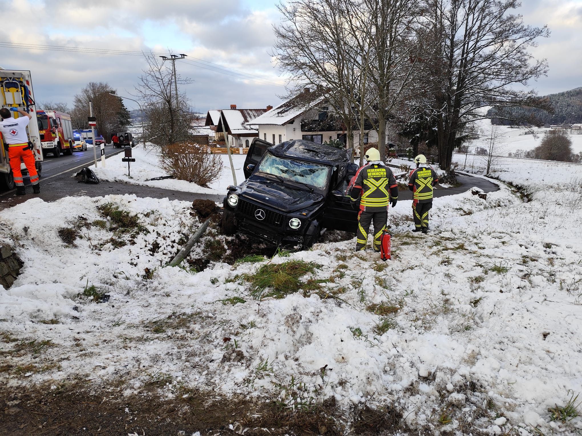 Am Nachmittag des 27.11. kam es auf der Kreisstraße CHA46 auf Höhe Vordermais zu einem schweren Verkehrsunfall. Hier hatte sich ein SUV aus bisher ungeklärter Ursache mehrmals überschlagen und eine Straßenlaterne umgerissen, ehe er in der angrenzenden Wiese zum stehen kam. Der Fahrer erlitt hierbei mittelschwere Verletzungen. Die alarmierte Feuerwehr Neukirchen b.Hl.Blut übernahm nach dem Eintreffen an der Einsatzstelle die Erstversorgung des Patienten und stellte den Brandschutz sicher. Zudem wurde eine Vollsperre des betroffenen Straßenanschnitts eingerichtet. Nach der Erstversorgung wurde der Fahrer vom Rettungsdienst in ein Krankenhaus eingeliefert. Die stabile Bauweise der Mercedes G-Klasse verhinderte vermutlich schlimmeres. Im Laufe des Einsatzes wurde der Straßenbaulastträger, die Fa. Bayernwerk sowie ein Abschleppunternehmen verständigt. Vor Ort waren zudem die Polizei sowie Kreisbrandmeister Michael Gutscher. Nach dem säubern der Unfallstelle von Fahrzeug- und Trümmerteilen war der Einsatz nach rund 1,5 Stunden beendet.