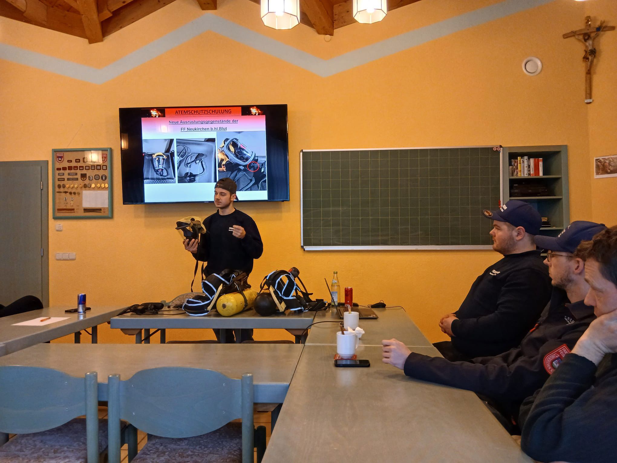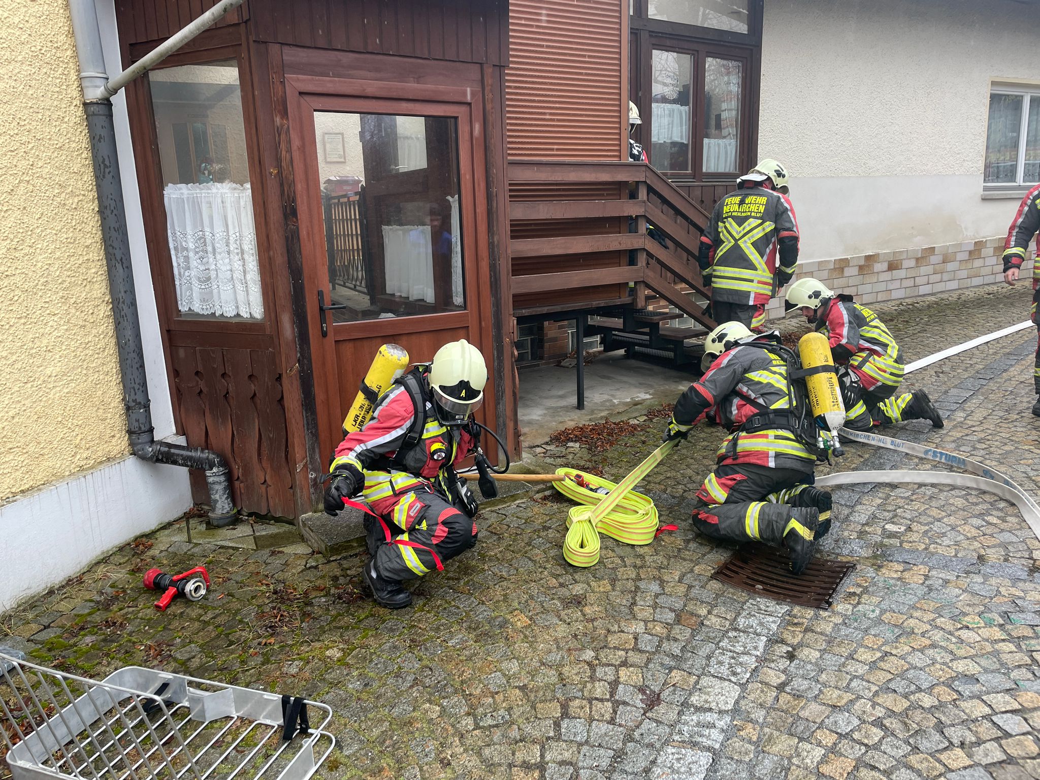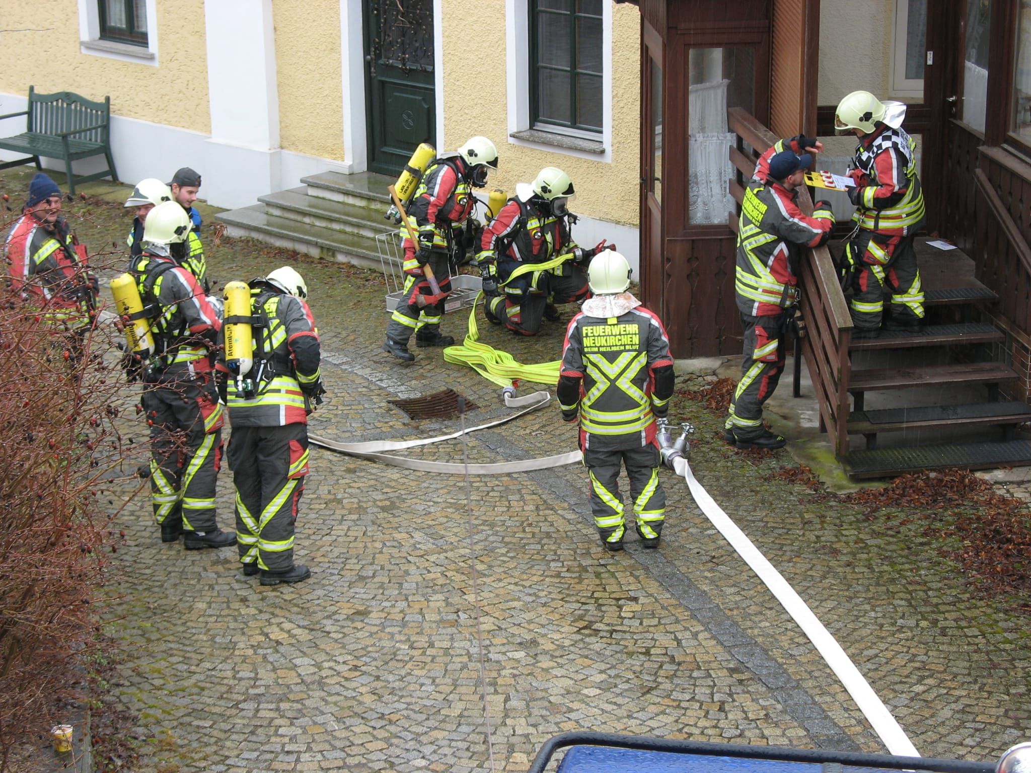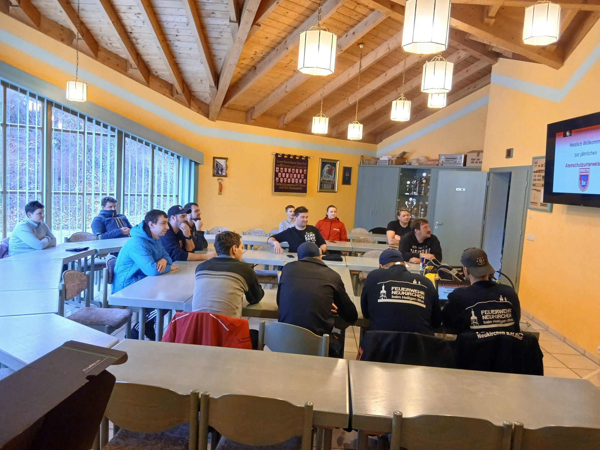 Samstag, 21.02. fand für die Atemschutz-Mannschaft der Feuerwehr Neukirchen b.Hl.Blut die jährlich vorgeschriebene Unterweisung statt. Leon Kraus, der neue Leiter des Atemschutz und sein ebenfalls neu ernannter Stellvertreter Simon Keml zeichneten sich erstmals verantwortlich das Team in Theorie und Praxis zu schulen. Nachdem man das vergangene Jahr Revue passieren lies, ging man auf verschiedene wichtige Grundsätze beim PA-Einsatz ein. Außerdem auf die richtige Vorgehensweise speziell bei einem Kellerbrand. Nachdem diese Themen mittels Powerpoint-Präsentationen abgeschlossen waren, wurde ein Haus samt Kellerräume im Ortskern als Brandobjekt angenommen. Hier musste, nach dem Einsatz eines Rauchgeräts, eine Brandbekämpfung sowie eine Personensuche bei sogenannter "Null Sicht" durch die Mannschaft abgearbeitet werden. Zum Abschluss wurde diese Praxisübung gemeinsam in ihrem Ablauf aufgearbeitet und besprochen. Nach dem Wiederherstellen der Einsatzbereitschaft gab es zum Abschluss im Feuerwehrzentrum noch eine Brotzeit spendiert von den beiden neuen Übungsleitern.