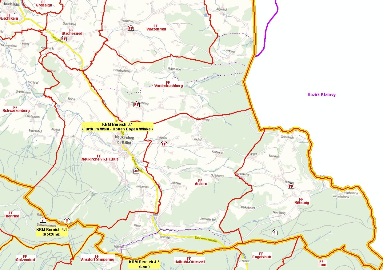 Auf der nachfolgenden Karte sehen Sie rot eingezeichnet die Gebietseinteilung der jeweiligen Feuerwehren. Rechts grenzen die böhmischen Landkreise und der Ort Nyrsko (Partnerfeuerwehr) an Neukirchen b.Hl.Blut an.